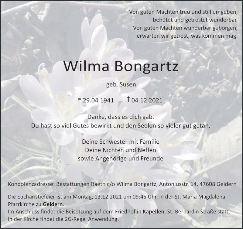 Hier finden Sie alle Traueranzeigen aus der Zeitung, die bisher für Wilma Bongartz erschienen sind. Weitere Traueranzeigen, die in der Zeitung erscheinen, werden hier ebenfalls aufgelistet