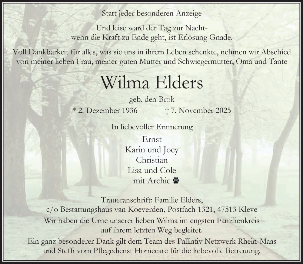 Hier finden Sie alle Traueranzeigen aus der Zeitung, die bisher für Wilma Elders erschienen sind. Weitere Traueranzeigen, die in der Zeitung erscheinen, werden hier ebenfalls aufgelistet