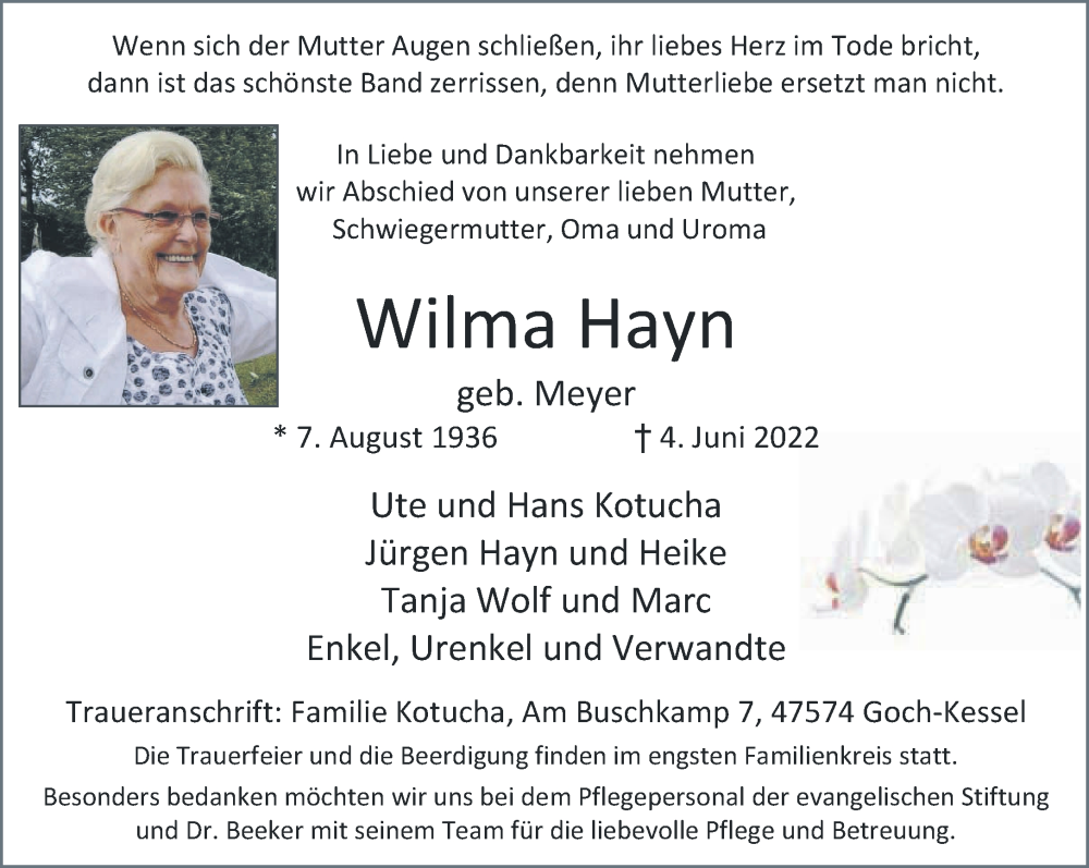 Hier finden Sie alle Traueranzeigen aus der Zeitung, die bisher für Wilma Hayn erschienen sind. Weitere Traueranzeigen, die in der Zeitung erscheinen, werden hier ebenfalls aufgelistet