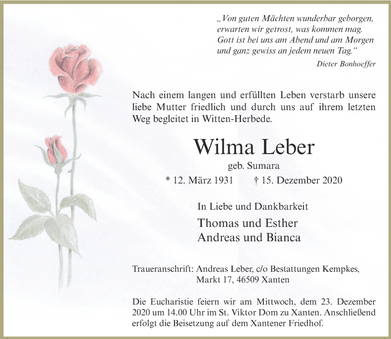 Hier finden Sie alle Traueranzeigen aus der Zeitung, die bisher für Wilma Leber erschienen sind. Weitere Traueranzeigen, die in der Zeitung erscheinen, werden hier ebenfalls aufgelistet