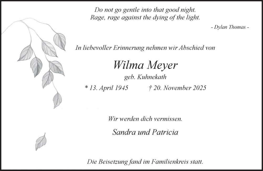 Hier finden Sie alle Traueranzeigen aus der Zeitung, die bisher für Wilma Meyer erschienen sind. Weitere Traueranzeigen, die in der Zeitung erscheinen, werden hier ebenfalls aufgelistet