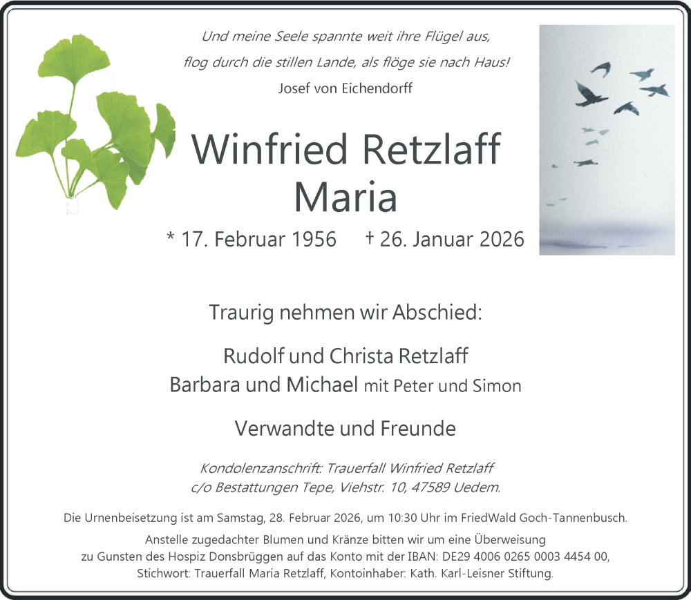 Hier finden Sie alle Traueranzeigen aus der Zeitung, die bisher für Winfried Retzlaff erschienen sind. Weitere Traueranzeigen, die in der Zeitung erscheinen, werden hier ebenfalls aufgelistet