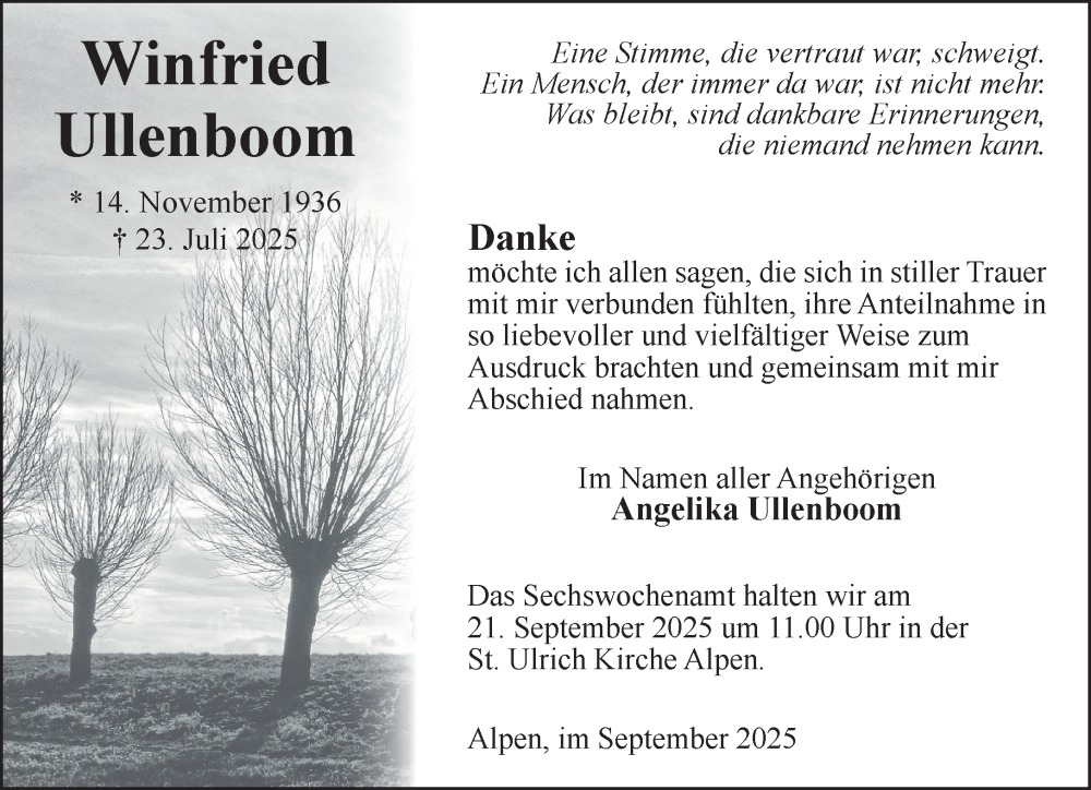 Hier finden Sie alle Traueranzeigen aus der Zeitung, die bisher für Winfried Ullenboom erschienen sind. Weitere Traueranzeigen, die in der Zeitung erscheinen, werden hier ebenfalls aufgelistet