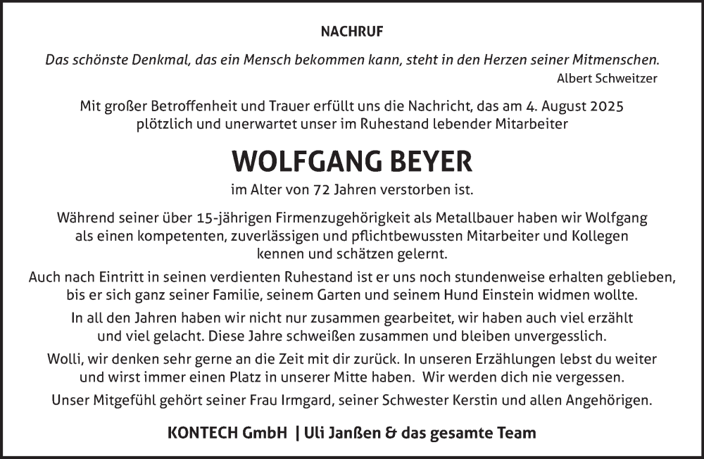 Hier finden Sie alle Traueranzeigen aus der Zeitung, die bisher für Wolfgang Beyer erschienen sind. Weitere Traueranzeigen, die in der Zeitung erscheinen, werden hier ebenfalls aufgelistet