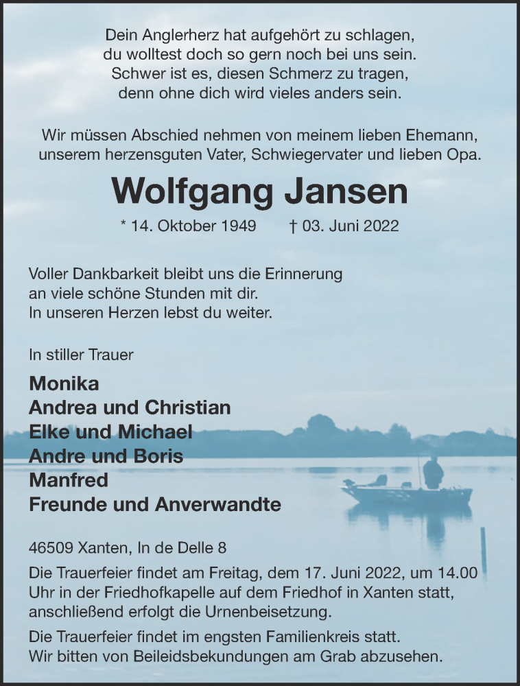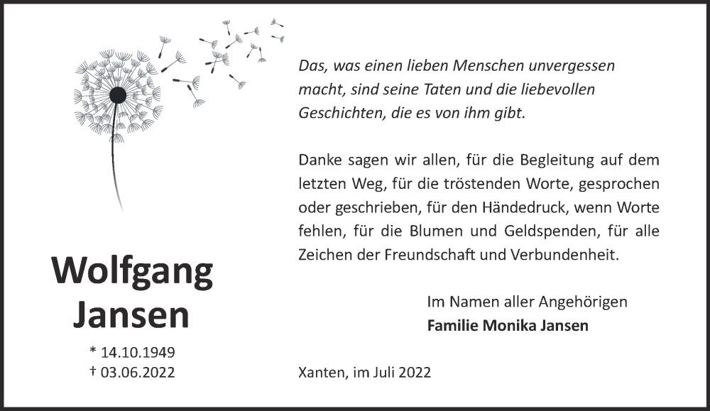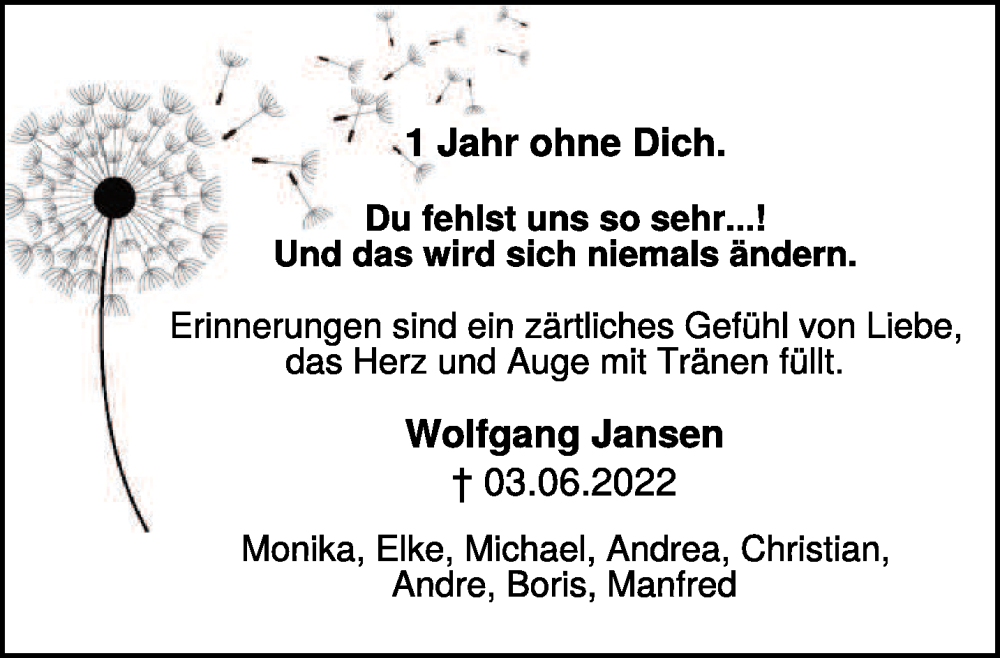 Hier finden Sie alle Traueranzeigen aus der Zeitung, die bisher für Wolfgang Jansen erschienen sind. Weitere Traueranzeigen, die in der Zeitung erscheinen, werden hier ebenfalls aufgelistet